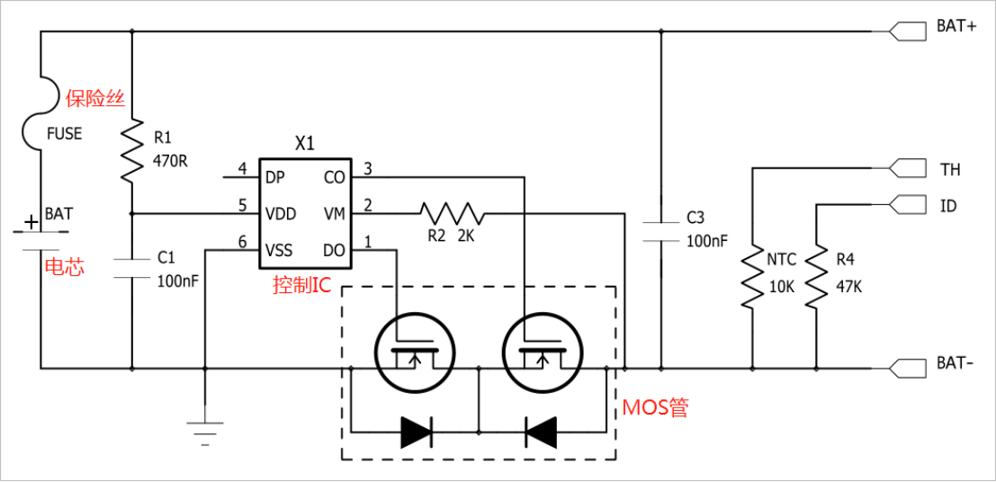 比如說,過充保護(hù)的原理是,在電池快充滿的時候,控制IC會檢測到電池的電壓,一旦達(dá)到閾值就會發(fā)信號,控制MOS管截止。一般把MOS管串聯(lián)在充電回路,或者作為充電開關(guān)使用。